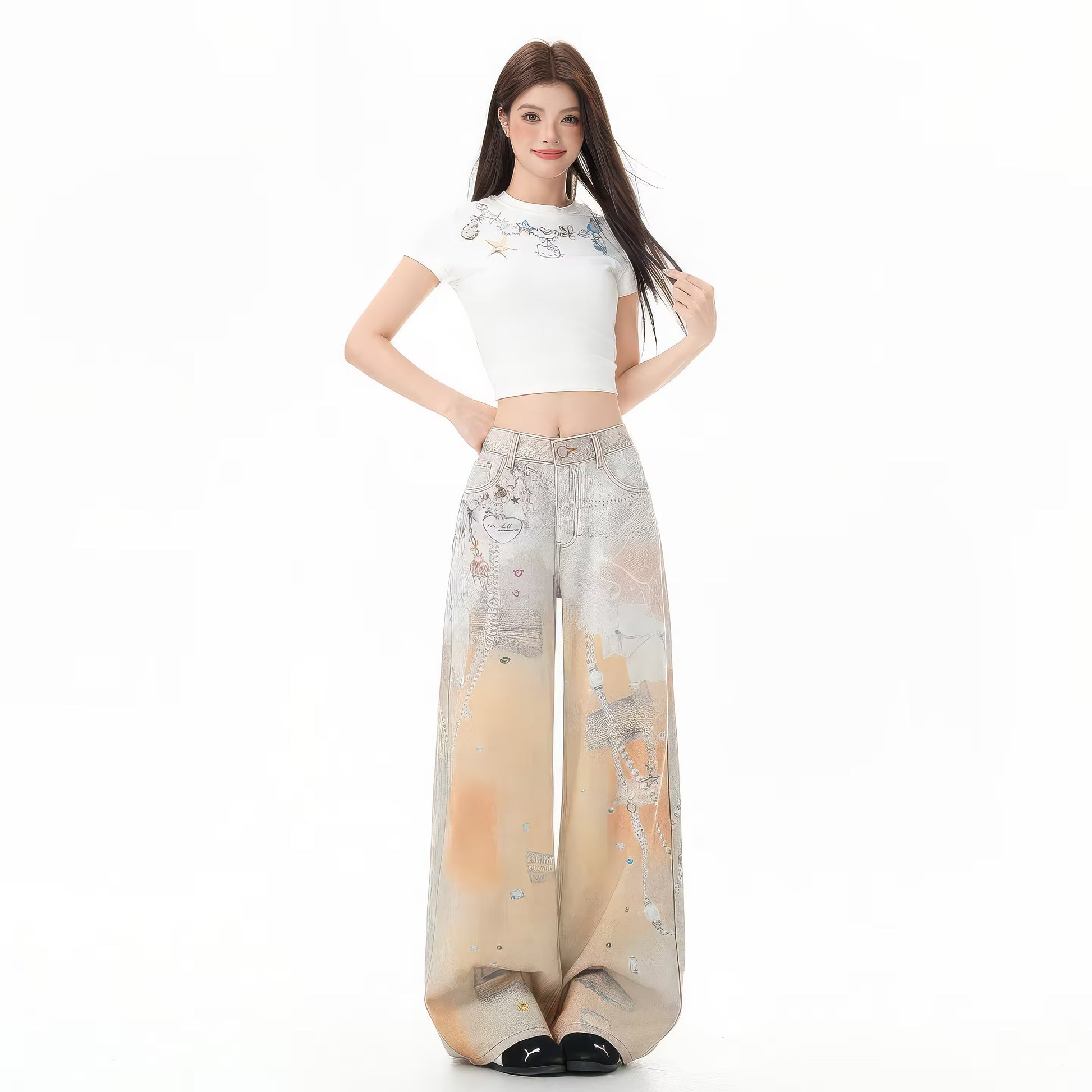Graffiti Orange Jeans With 3D Print have a casual cut and high waist.